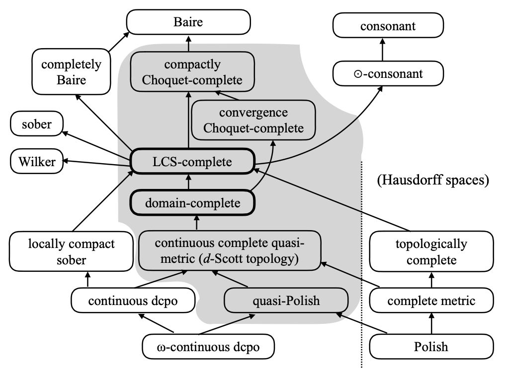 Let me reproduce a diagram from [1], showing the relation between LCS-complete spaces and various other classes of spaces. There are many classes of spaces here that I will not even try to define. An arrow from A to B means that every A is a B. Hence, for example, every locally compact sober space is LCS-complete (I guess that this much was obvious); every quasi-Polish space is LCS-complete, too.